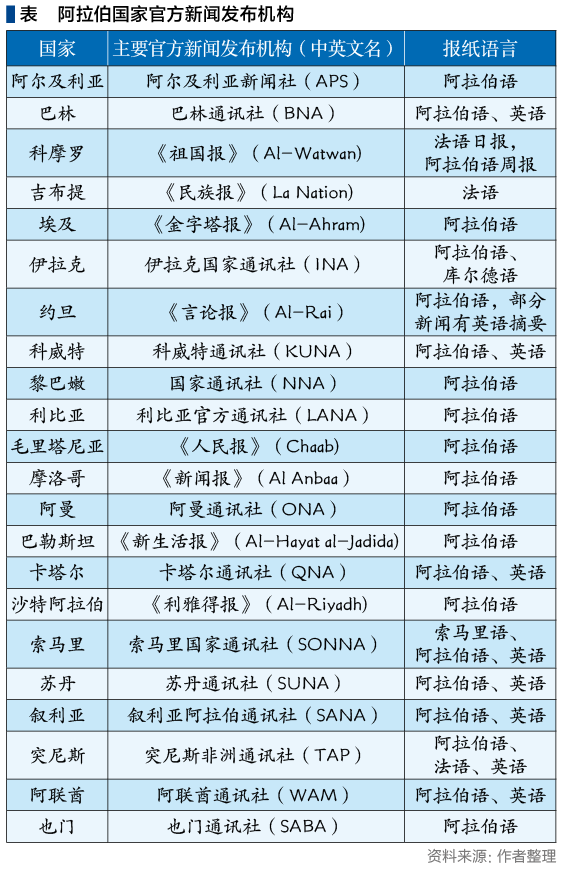 除《金字塔报》和《利雅得报》外,阿拉伯国家的官方媒体影响范围基本局限国内,以本国政府立场发声,仍有深刻影响力,以上是22个阿拉伯国家的官方新闻发布机构。