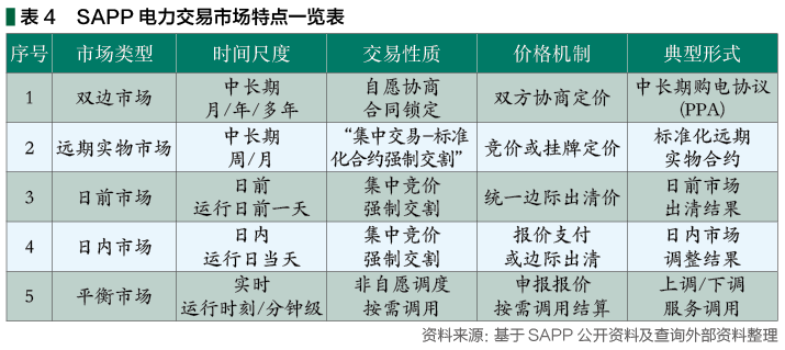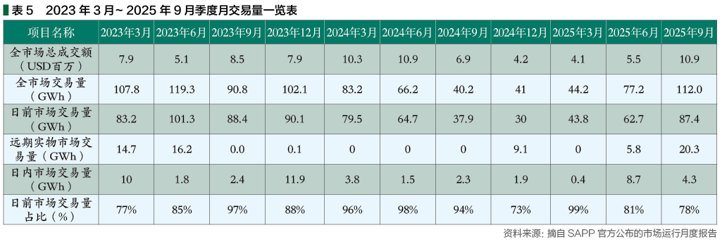 总体来看,双边市场为场外交易,场内交易则通过远期实物市场进行标准化集中交易,进而通过日前/日内市场计划内自愿竞价,最终通过实时平衡市场进行非自愿调整平衡,构成电力交易平台的完整时序链条。SAPP竞争性电力市场的建立是电力市场交易方式发展的一项重要成就,现行的日前市场(DAM)是竞争性市场的核心机制,也是主要的交易方式。从摘取的数据来看,日前市场(DAM)交易量占据全市场交易量主导地位(见表5)。