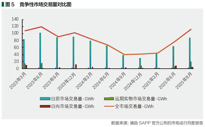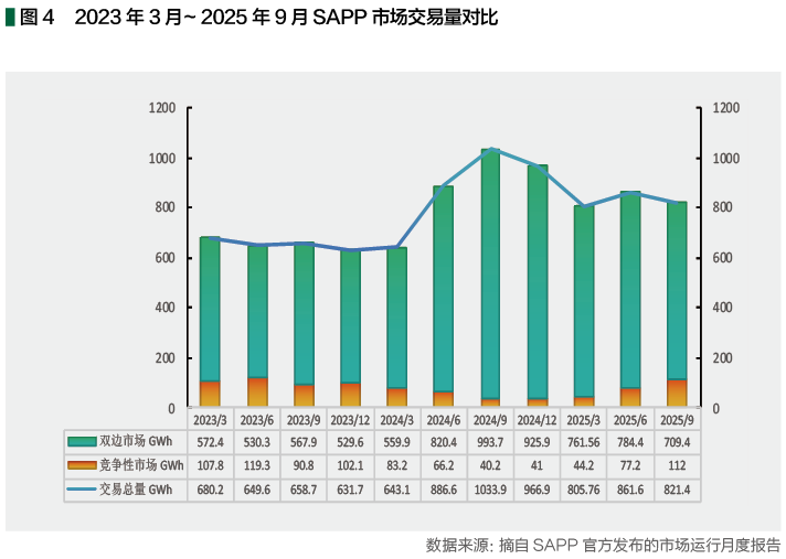 从SAPP公布的市场运行月度报告截取2023年3月至2025年9月的交易数据不难发现,尽管已完成向竞争性市场的转型,双边市场交易机制仍占据电力平台交易成交总额的80%以上。