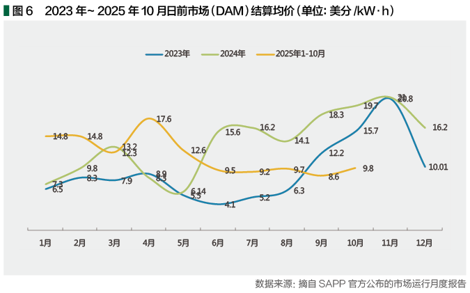 与全市场成交量的高度随机波动一致,主导竞争性市场的日前市场(DAM)交易结算均价同样未表现出可识别的周期性或趋势性特征。查阅市场运行月度报告披露情况,不管是在用电标准时段或低谷时段,一旦出现电力短缺,市场成员愿意不计时段地支付更高电价,从而形成显著的价格信号扭曲。如下图6所示,自2023年1月至2025年10月,日前市场(DAM)最低结算均价4.1美分/(kW·h) 出现在2023年6月,最高结算均价21.0 美分/(kW·h) 则出现在2024年11月。