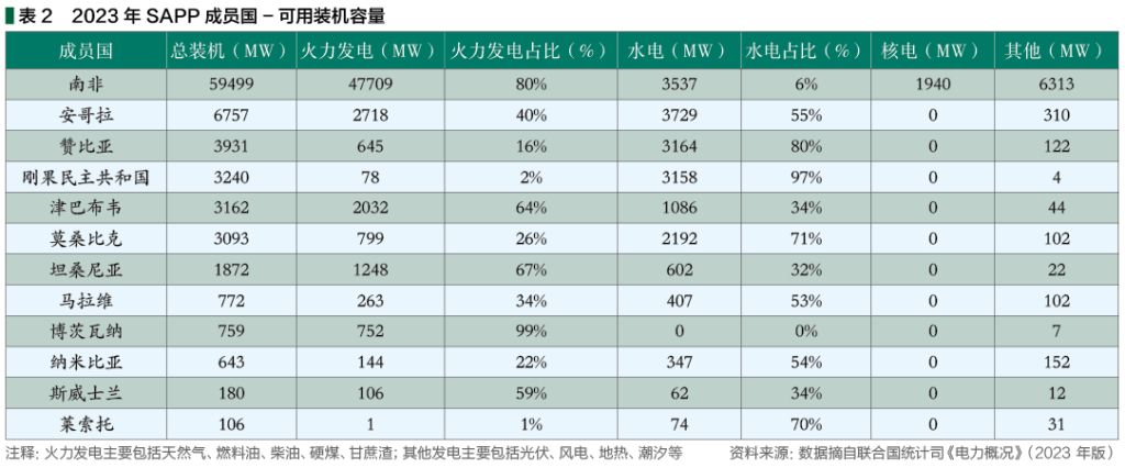 联合国统计司出版的现行《电力概况》(2023年版)统计了2018年~2023年间200多个国家与地区的电力行业概况,涵盖各国(地区)的发电量、电力贸易与消费量、可用装机容量、热电厂投入与效率等关键指标。南部非洲电力联盟各成员国2023年电力生产主要来源和对应的可用装机容量参考数据汇总见表2。