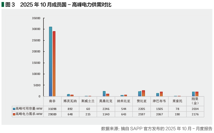 2025年10月SAPP运营成员国高峰可用容量(MW)、高峰电力需求(MW)如图3所示。