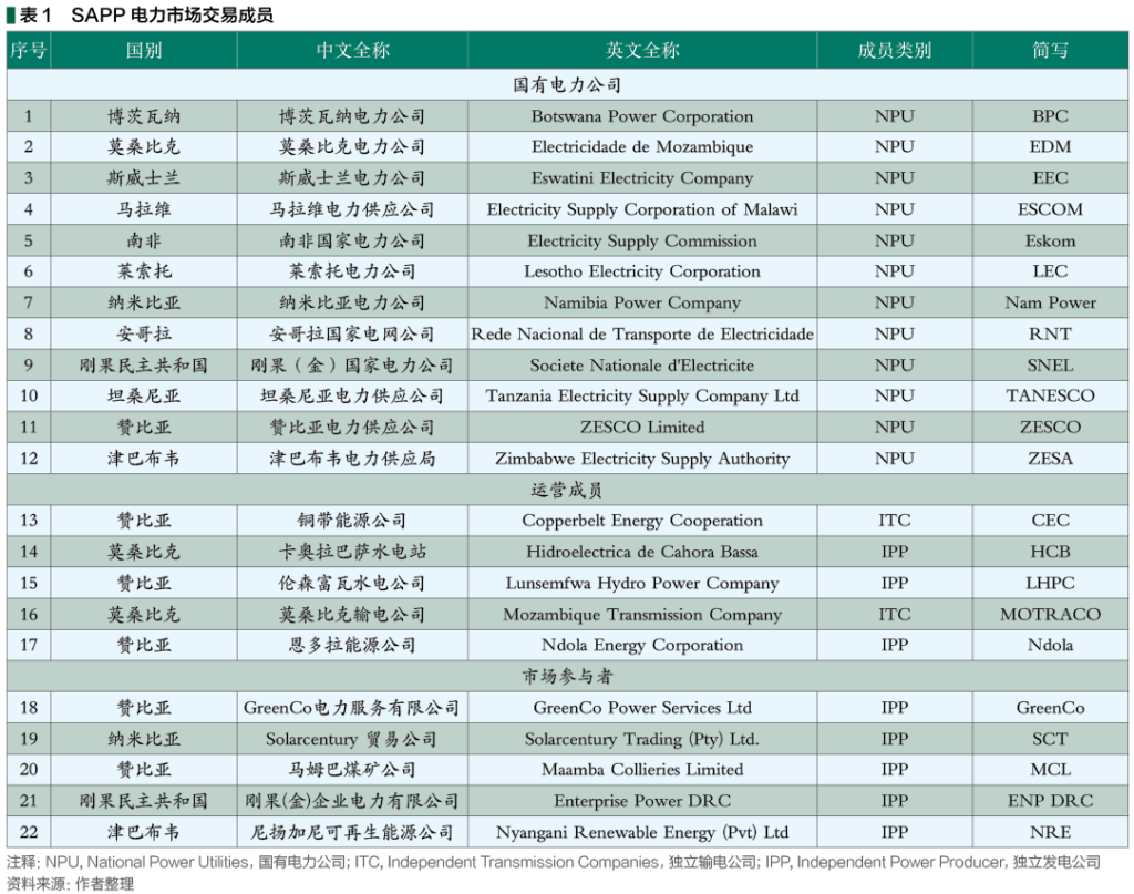 南部非洲电力联盟(SAPP, Southern African Power Pool)是非洲大陆五大电力联盟之一,1995年8月在南非肯普顿公园举行的南部非洲发展共同体(SADC, Southern African Development Community)峰会上成立。现有成员国12个,依次为:安哥拉、博茨瓦纳、刚果民主共和国(刚果[金])、斯威士兰、莱索托、马拉维、莫桑比克、纳米比亚、南非、坦桑尼亚、赞比亚、津巴布韦。据SAPP官方资料,截至2025年在SAPP电力交易平台开展跨境电力交易的共有22个成员(见表1),包括12个成员国的国有电力公司、5家独立输电/发电公司、以及5个活跃于SAPP竞争性电力市场的运营成员。