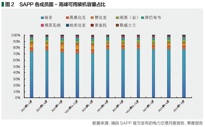 根据SAPP发布的2025年10月月度报告可知,南非高峰可用容量31GW,高峰电力需求29GW,满足国内使用后,仅有2GW的裕量可在SAPP电力交易市场交易,供区域内国家调度使用。以可用装机容量59GW来看,这意味着南非有将近28GW的电力产能处于不可用/检修/煤质差等状态。而作为SAPP供电主导国家,当南非境内供电受限时,对邻国可出口的灵活电力就需收缩,区域电力需求缺口立刻显性化。