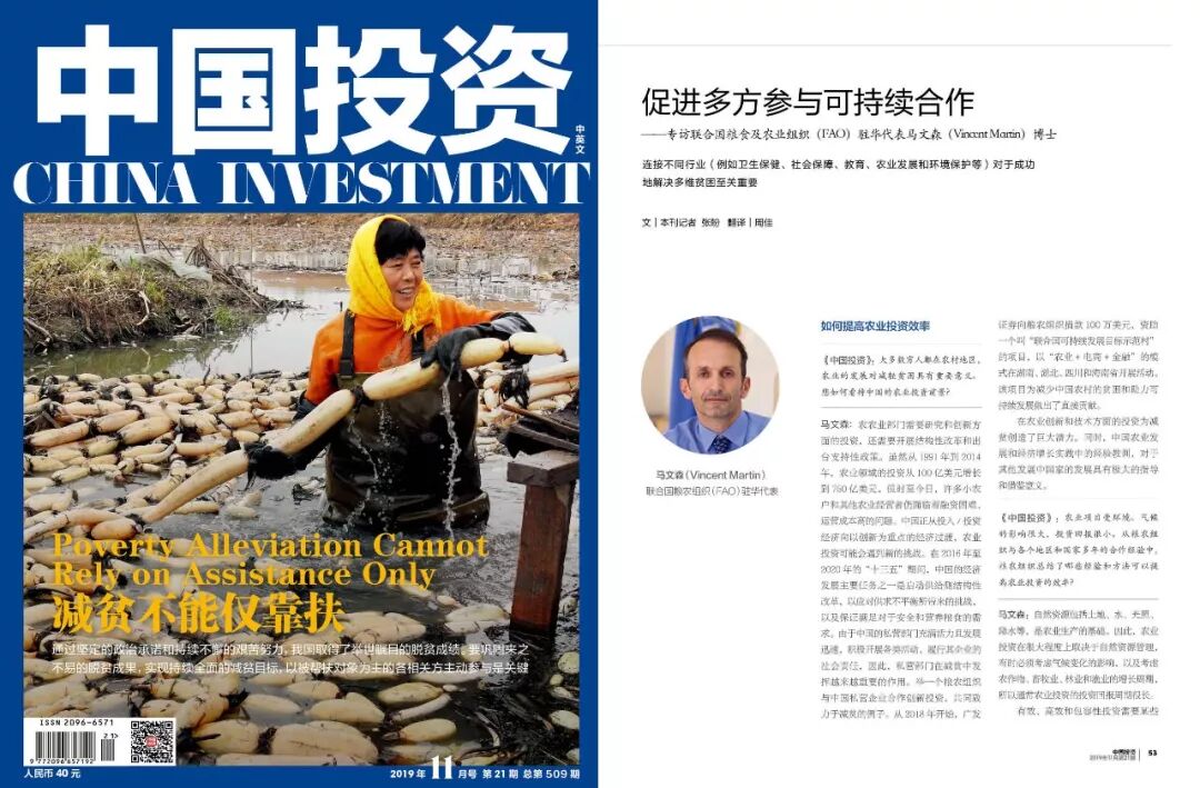 您做在的位置: 中国投资 > 封面故事 > 促进多方参与可持续合作 ——专访联合国粮食及农业组织(FAO)驻华代表马文森(Vincent Martin)博士