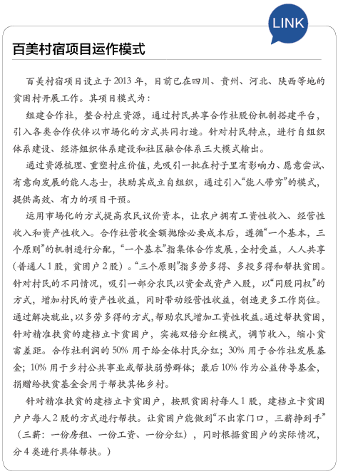其中百美村宿项目是中国扶贫基金会于2013年发起,以乡村旅游为抓手的创新型产业扶贫项目,该项目探索全新的“乡村旅游扶贫+”模式,致力于搭建乡村和外部联结平台,重估贫困村价值,创造以村为本的发展机会。以村民合作社为依托,积极引入社会资金、信息和人才等要素,推动乡村可持续发展。2013年5月至2018年12月31日,项目累计接受捐赠1.18亿元,累计支出5934.71万元。2018年度,项目筹集款物2900万元,投入资金2924.99万元,惠及7省18县(区)19个村庄,其中灾后重建村庄2个,贫困村庄10个,深度贫困村庄5个,一般村庄2个,19个村庄共计25476人,其中建档立卡贫困户5269人。截至2018年底,已投入运营村庄4个,尚未运营村庄共15个,其中运营调试4个、建设施工3个、规划设计4个、待启动4个。