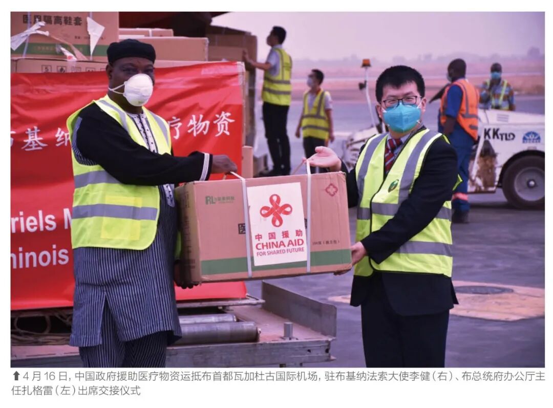 他希望有一个中国医疗队能来帮助他们阻止病毒的传播。” 2020年4月16日晚,中国向瓦加杜古运送了一大批医疗防护设备、口罩和红外测温温度计。中国驻联合国大使李健表示,“这是见证两国友谊的伟大日子。这是中国政府同布基纳法索人民团结一心的见证。这些防护装备将提供给抗击新冠肺炎疫情的一线医务人员。”在这一阶段之后,其他的防护用品捐赠也会随之而来。在抗击新冠肺炎疫情关键阶段,中国尽管面临同样困难,但仍能帮助布基纳法索政府和人民。