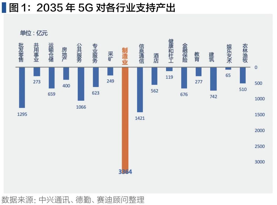 5G将让ICT与传统行业真正实现深度融合,将网络变得更加开放,为垂直行业应用创新提供综合能力。一方面,传统行业未来软件化、智能化将是大势所趋。另一方面,传统行业具备场景决定能力和完善的知识价值体系,5G将促进ICT技术与其需求深度匹配。据统计,预计在2035年,5G对各个行业的支出产出中,制造业领域的支持产出遥遥领先,超过3000亿元。