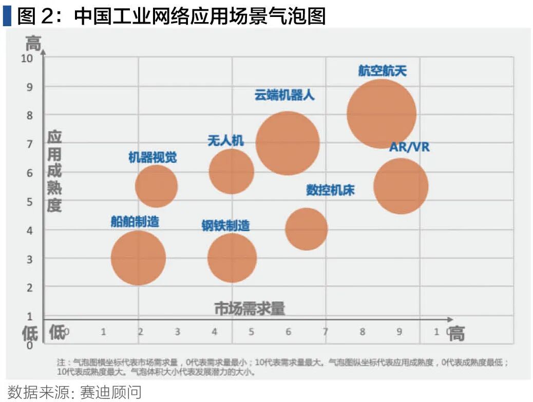 随着我国5G技术的不断更新,5G在制造业各个领域的需求量不断上升。目前我国5G在制造业中多应用于大飞机制造、无人机、云端机器人、AR/VR、钢铁制造中。航空航天领域由于具有较高技术含量和较高附加值,其资本投入高、信息密集度高、带动能力较强,和5G的结合在市场需求量及应用成熟度均排在行业首位。云端机器人行业,随着人工智能、云计算等技术与机器人的不断融合,5G的应用成熟度仅次于航空航天。未来随着企业智能化程度的提高、生产设备信息化率和联网率的提升, 5G在钢铁制造、船舶制造领域的应用也会逐步打开。