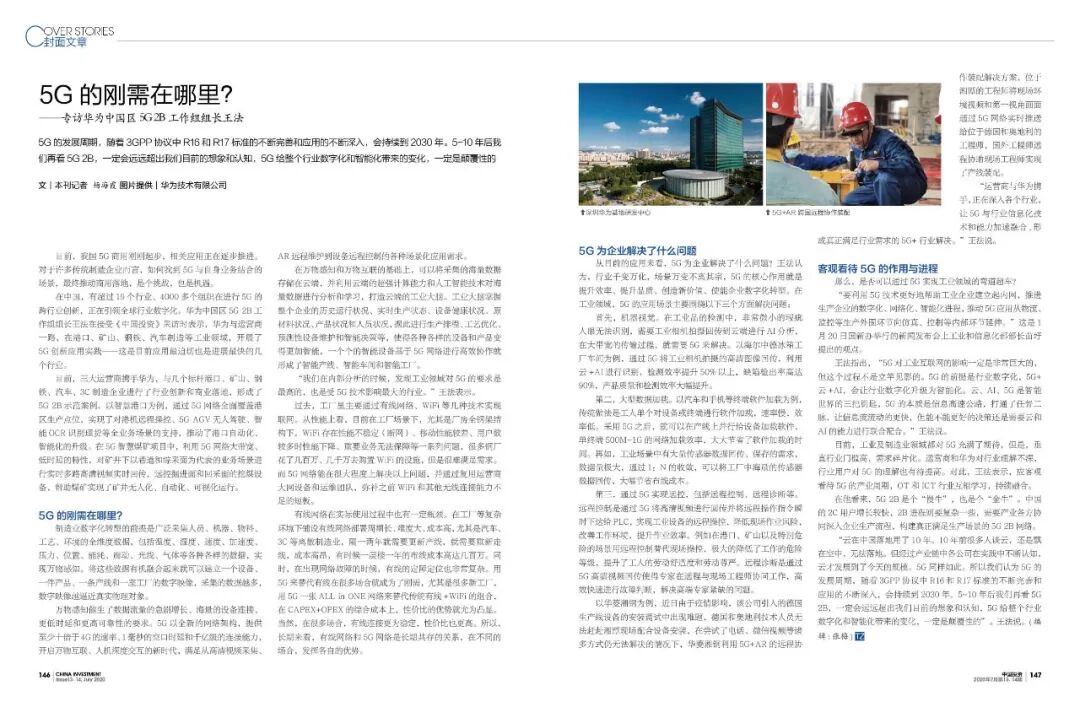 您做在的位置: 中国投资 > 封面故事 > 5G的刚需在哪里? ——专访华为中国区5G 2B工作组组长王法