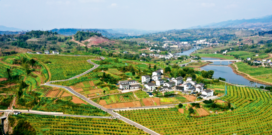 ⬆ 重庆渝北深化农村“三变”改革 加快乡村振兴步伐, 2021年3月5日,渝北区大盛镇青龙村通过宜机化(适宜机械化)改造后的现代化果园(新华社记者 刘潺摄 无人机照片)