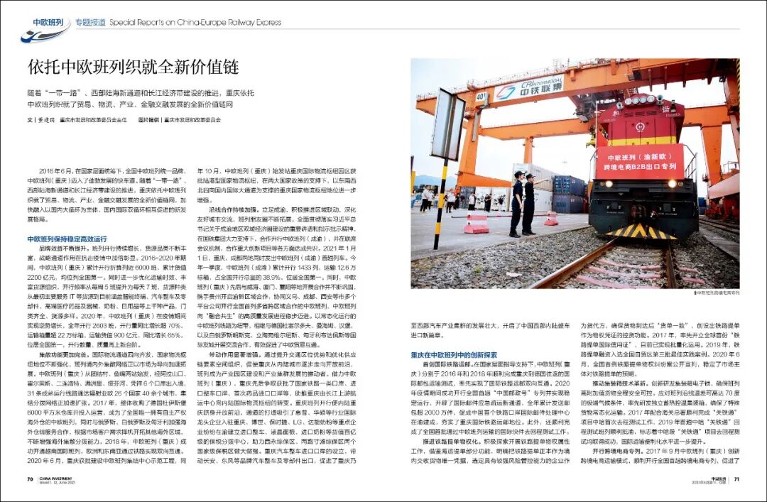 2016年6月,在国家层面统筹下,全国中欧班列统一品牌,中欧班列(重庆)迈入了蓬勃发展的快车道。随着“一带一路”、西部陆海新通道和长江经济带建设的推进,重庆依托中欧班列织就了贸易、物流、产业、金融交融发展的全新价值链网,加快融入以国内大循环为主体、国内国际双循环相互促进的新发展格局。