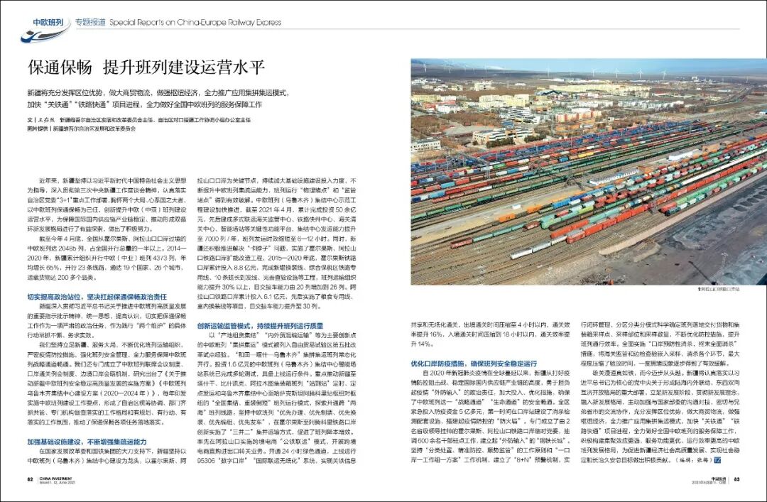 近年来,新疆坚持以习近平新时代中国特色社会主义思想为指导,深入贯彻第三次中央新疆工作座谈会精神,认真落实自治区党委“3+1”重点工作部署,胸怀两个大局、心系国之大者,以中欧班列保通保畅为己任,创新提升中欧(中亚)班列建设运营水平,为保障国际国内供应链产业链稳定、推动形成双循环新发展格局进行了有益探索,做出了积极努力。