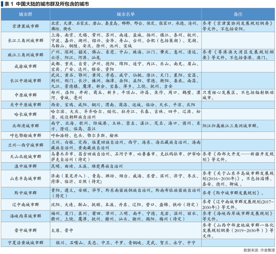 业界有许多关于城市群的划分方法,不同方法界定的城市群的范围不同,本文采用手机信令大数据,通过“人流”划分城市群的范围,并为“十四五”时期新型城镇化规划以及建立适应现代化导向的城市空间提供大数据决策支撑。作为本文研究对象的城市群主要包括以下几类,并划分为表1: