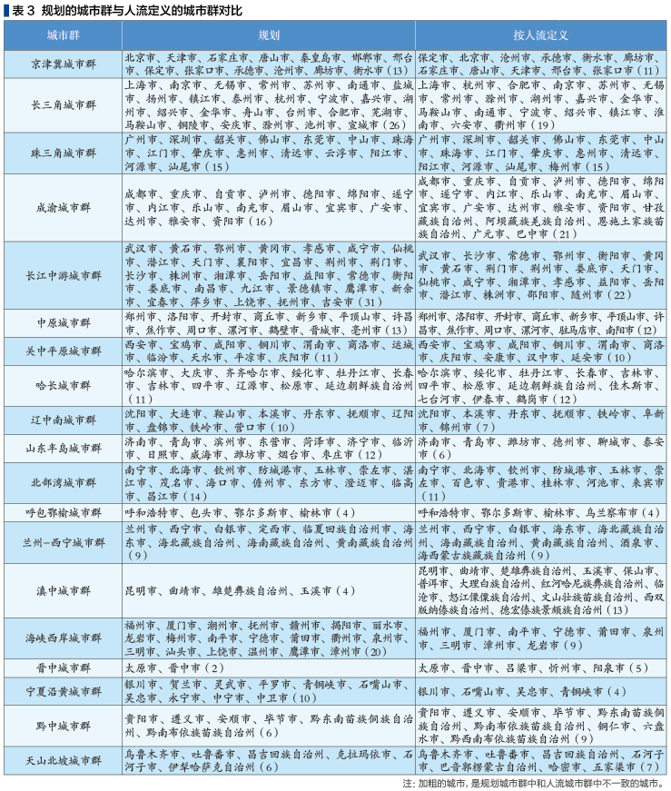 进一步,将城市群规划和按人流定义的城市群各自包括的城市进行对比分析。规划中的19个城市群共包含233个城市,而按人流定义的19个城市群共包含205个城市,重合度为88%。在19个城市群中,有6个城市群人流定义的城市数量高于规划,10个城市群人流定义的城市数量低于规划,3个城市群在城市数量上是一致的。分区域看,西南西北地区的城市群,如成渝、滇中、晋中和黔中城市群,人流识别出的城市群范围要大于规划;而中部和东部部分城市群,如长三角、长江中游和海峡西岸等城市群,人流识别出的城市群范围要小于规划。