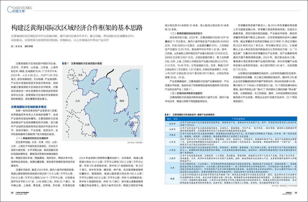 泛黄海国际次区域包括中国的河北省、北京市、天津市、山东省、江苏省、上海市和日本、韩国,区域面积为96.77万平方千米,2024年,人口4.95亿人,GDP11.65万亿美元。依托地缘相近、文化相通、产业链成熟、产业互补性强和经贸关系密切等优势,加快构建泛黄海国际次区域经济合作框架,对推动区域经济一体化发展和中日韩自由贸易协定早日达成,探索国际次区域合作发展新机制和新路径,具有重要的现实意义。