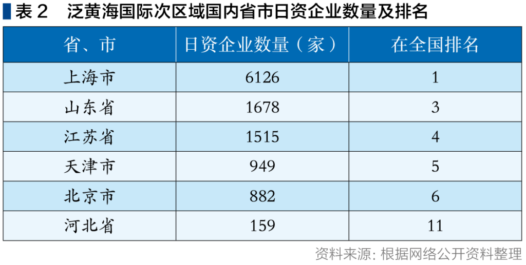 六省市与日韩经济联系密切。2024年,泛黄海国际次区域国内六省市对日本的贸易总额达到1706.03亿美元,占全国对日贸易总额的55.34%;对韩国贸易总额达到982.94亿美元,占全国对韩贸易总额的29.96%。截至2024年年底,江苏省、北京市、上海市的韩资企业数量分别达到3538家、2012家、1000家。目前,三星电子(苏州)、SK海力士(无锡)、起亚汽车(盐城)、LG新能源(南京)等韩国企业均落户江苏。中韩盐城产业园更是集聚大批汽车、电池等领域的韩资企业。2024年,威海市韩资企业数量达到995家,占全市外资企业总数的54.1%。威海市2600多家企业与韩国有贸易往来,对韩进出口十年间增长67.8%,2024年威海口岸对韩进出口位居全国第三位,对韩跨境电商零售出口连续7年居山东省首位,2024年跃居全国首位。截至2022年底,烟台累计批准韩资项目4207个,实际利用韩资66.06亿美元,是山东省韩国大企业最集中的城市。截至2022年6月,上海、江苏、山东、天津、北京等省市的日资企业数量在全国排名靠前(见表2)。