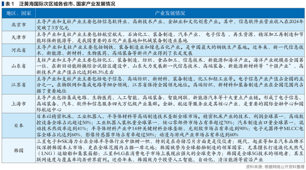 产业发展基础好。泛黄海国际次区域产业基础较好,产业发展水平较高,各自形成了特色鲜明且具有较强竞争力的支柱产业和主导产业(见表1)。