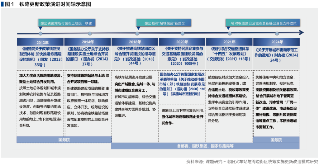 国家层面高度重视铁路低效空间的盘活与再利用。自2013年,《国务院关于改革铁路投融资体制加快推进铁路建设的意见》提出“铁路站场与城市土地统一联建”以来,多项政策陆续出台,明确支持铁路车站及周边用地综合开发,鼓励站城融合、产城一体。2021年,《现代综合交通枢纽体系“十四五”发展规划》进一步提出拓展投融资渠道、加大财政投入,为枢纽及城市更新提供有力支撑。