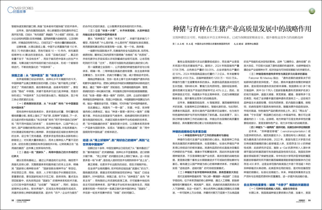 种猪是生猪产业的“芯片”,育种则是实现种业振兴的核心引擎。面对全球竞争加剧、资源约束趋紧、消费需求升级的多重挑战,唯有坚持自主创新、强化种源保障、推进科技赋能,才能真正实现我国生猪产业的高质量、可持续发展。目前,我国已经有部分企业与国外能达到“并跑”水平,未来,我国应加快从“跟跑”向“并跑”乃至“领跑”转变,培育一批具有国际竞争力的民族种猪品牌,为中国饭碗装上“中国芯”。