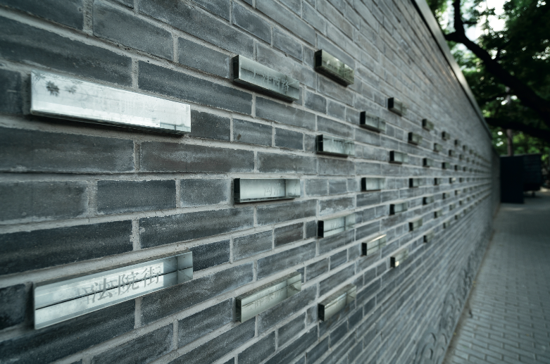 我们嵌入玻璃展窗,轮展中关村发展史的老照片;利用原有凸起结构做了四个“海街驿站”,配上混凝土座椅和镂空花砖顶棚,让人可以歇脚聊天;东侧墙面展示变迁影像,西侧则镶嵌刻着“海淀庄”“稻香园”等消失地名的发光玻璃砖,晚上亮起来像星星一样,唤起人们对过去的回忆。
