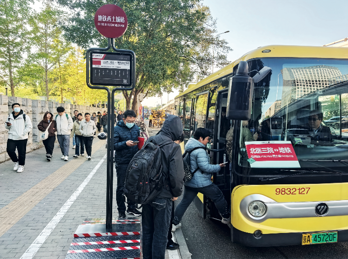 通过空间的“硬更新”路线难以走通,我们委托了专业的道路交通设计院(交通发展研究院)对以三院为核心的整个外部交通系统拥堵的问题和成因进行了系统调研和提出系统解决方案,以及对应的模拟。通过抓取手机信令发现,地铁牡丹园站、西土城站到达的乘客与北医三院有极大的相关性(数据)。而从两个地铁站前往三院及周边医院的大部分是就医和医院的员工,造成每天数千辆的共享单车盘踞在本就不宽的辅路上,进一步增加了拥堵,而现状的公交系统恰恰缺乏这一块拼图。于是,我们深化制定一条公交微循环接驳环路,利用花园北路南北两侧的流量差,采取小公交短距离2公里环线的方式,有效的为公共交通系统拼上了最后一块拼图。2025年秋天,这条线路展开试运行。根据统计结果,线路运营状况良好,政府补贴后可以实现盈利。到冬天,这条微循环线路已经可以在百度、高德地图上查到,每天为500人次的患者和医护人员提供服务,同时也极大缓解了医院门前小黄车成片的尴尬。