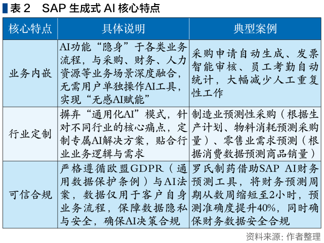 目前,SAP已推出130+开箱即用的生成式AI,覆盖预测分析、智能推荐、文案生成、对话助手等多个场景,适配制造、零售、医疗、金融等多个行业,其核心特点可概括为三点,如表2所示。