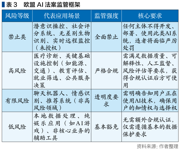 2024年8月1日,欧盟AI法案正式实施,分阶段落地至2027年,这是全球首个针对AI技术的综合性监管法案,为包括德国在内的欧盟成员国提供了统一的AI监管框架,其核心逻辑是“风险分级监管”,根据AI应用的风险等级,采取不同强度的监管措施,确保AI技术的安全可控,如表3所示。
