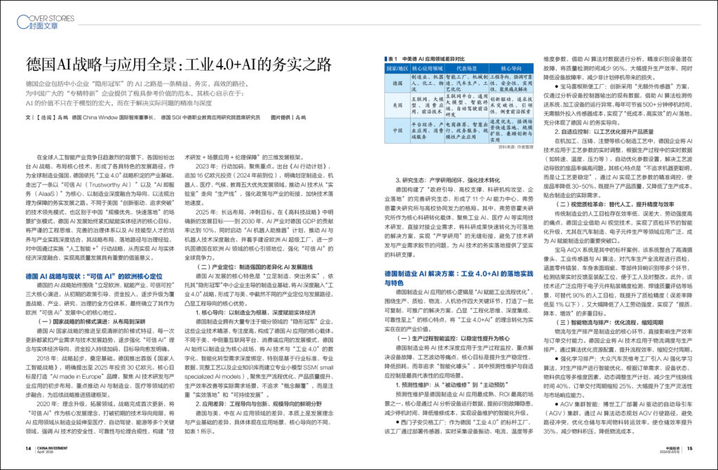 在全球人工智能产业竞争日趋激烈的背景下,各国纷纷出台AI战略、布局核心技术,形成了各具特色的发展路径。作为全球制造业强国,德国依托“工业4.0”战略积淀的产业基础,走出了一条以“可信AI (Trustworthy AI) ”以及“AI即服务 (AIaaS)”为核心、以制造业深度融合为导向、以法规治理为保障的务实发展之路。不同于美国“创新驱动、追求突破”的技术领先模式,也区别于中国“规模优先、快速落地”的场景扩张模式,德国AI发展始终紧扣赋能实体经济的核心目标,将严谨的工程思维、完善的治理体系以及AI技能型人才的培养与产业实践深度结合,其战略布局、落地路径与治理经验,对中国通过实施“人工智能+”行动战略,从而实现AI与实体经济深度融合、实现高质量发展具有重要的借鉴意义。