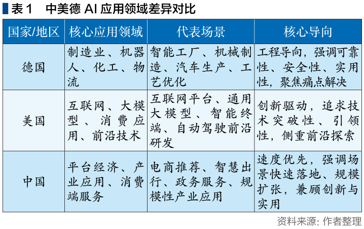 德国与美、中在AI应用领域的差异,本质上是发展理念与产业基础的差异,具体体现在应用场景、核心导向的不同,如表1所示。