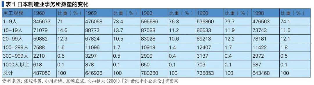 日本是制造业大国。可以毫不夸张地说,中小企业是日本先进制造业竞争力的源泉所在。与世界主要工业国的经验不同,日本的工业化并不是一个垂直一体化的大企业成长起来,将中小企业淘汰出局的过程。相反,在社会化大生产不断深化,迂回生产链条不断细化的过程中,中小企业的数量持续增加。表1清晰反映了这一特点。在日本经济高速增长,产业升级突飞猛进的1960-80年代,大型制造业企业的数量一直保持平稳,而300人以下中小制造业企业的数量,尤其是99人以下小企业的数量迅猛增长。正是在这一过程中,一大批从事某种零部件生产,专注于某道工序的高度专业化的中小企业相继成长起来。