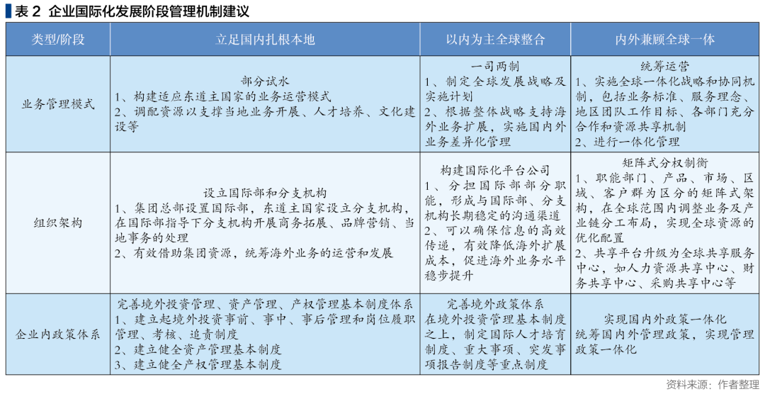 不同企业的发展阶段不同,其对国际化的需求和方式也不一样,企业的国际化进度可以划分为“立足国内扎根本地”、“以内为主全球整合”和“内外兼顾全球一体”三个阶段,各个阶段企业业务管理模式、组织架构、企业内管理政策体系均有不同的要求。企业需要根据自身特点和所处环境,参考和对标国际一流企业,制定宏观发展策略,健康稳定的推进国际化进程。