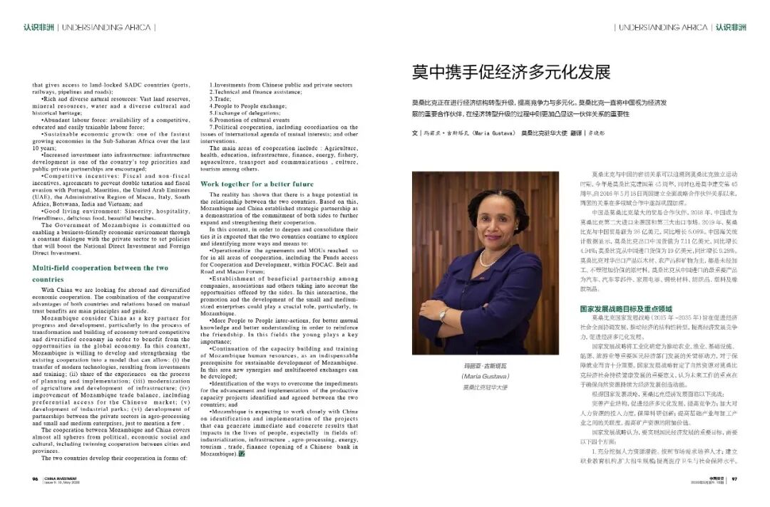 莫桑比克正在进行经济结构转型升级,提高竞争力与多元化,以更好地利用经济全球化带来的机遇,莫桑比克一直将中国视为经济发展的重要合作伙伴,在经济转型升级的过程中则更加凸显这一伙伴关系的重要性。鉴于此,莫桑比克愿与中国在现有的合作模式基础上进一步深化合作,希望莫桑比克未来能够: