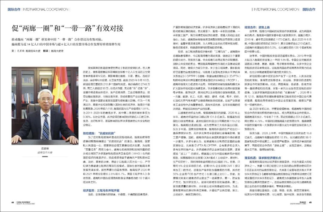 近年来,中国对越投资呈现迅猛增长势头。2019年中国大陆注入越南的资金是上一年的1.65倍。中国企业对越投资涵盖加工制造、基建、能源、电子商务等领域。众多中资企业在越投资项目卓有成效。这既是两国政府和商界共同努力的成果,也充分体现越南营商环境的巨大吸引力。