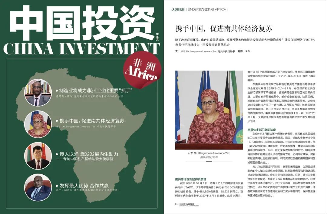 除了改善营商环境、出台财政激励措施、签署投资条约和促进投资活动各种措施来吸引外国直接投资(FDI)外,南共体还将继续为中国投资探索其他机会。新冠肺炎疫情在一定程度上增加了对高效物流和贸易便利化的需求。人们还认识到,有必要采用新的经营和贸易方式(如电子贸易),这就要求实现有效运作的互联互通和打造自动化系统。既然成员国正在逐步取消限制,实现复工复产,给人员和工业品的跨境流动提供便利条件就是必要的一步。