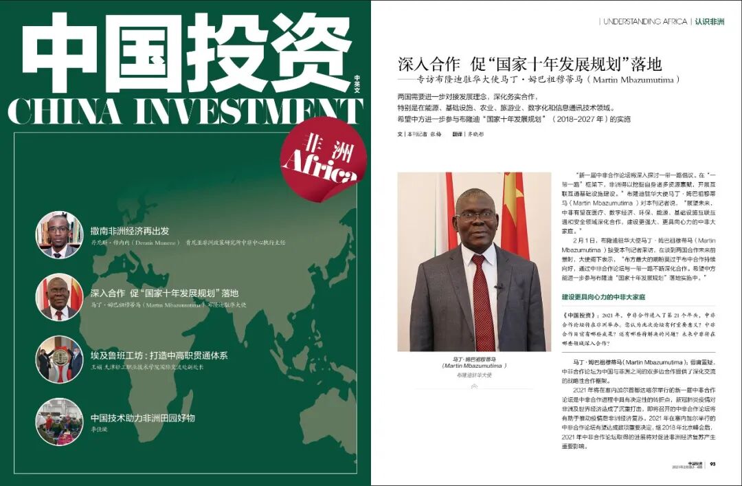 2月1日,布隆迪驻华大使马丁·姆巴祖穆蒂马(Martin Mbazumutima )接受本刊记者采访,在谈到两国合作未来前景时,大使阁下表示,“布方最大的期盼莫过于布中合作持续向好,通过中非合作论坛与一带一路不断深化合作。希望中方能进一步参与布隆迪“国家十年发展规划”落地实施中。”