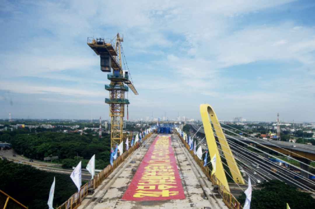 ⬆ 2021年3月8日,印尼雅万高铁全线最大跨度连续梁成功合龙(新华社发 维里摄)