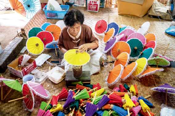 ⬆2020年11月1日,工匠在泰国清迈市博桑伞村的纸伞制作中心粘贴伞面( 新华社记者 张可任摄)