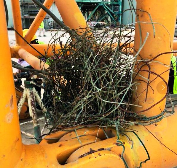 为确保项目工作正常推进,操作人员不得不将鸟巢拆除,操作人员试图用手将鸟巢拆下,但却着实低估了鸟的实力。整个鸟巢整体被铁丝紧紧地绑扎在了臂杆上,最终借助工具才顺利拆了下来。操作人员笑称,这个鸟巢可以抵抗八级大风。经测量,该鸟巢直径约40cm,高度约30cm,重量约为2.1kg,真可谓是一项庞大工程。