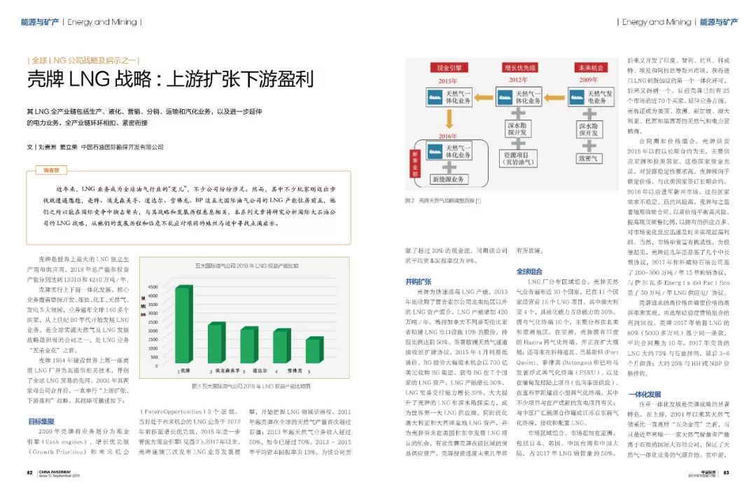 2009年壳牌将业务划分为现金引擎(Cash engines)、增长优先级(Growth Priorities)和未来机会(FutureOpportunities)3个层级。当时处于未来机会的LNG业务于2012年前移至增长优先级,2015年进一步晋级为现金引擎(见图2)。2017年以来,壳牌连续三次发布LNG业务发展展望,开始把握LNG领域话语权。2011年起壳牌在全球的天然气产量首次超过石油;2013年起天然气业务收入超过50%,如今已超过70%。2013-2015年平均资本回报率为13%,为该公司贡献了超过30%的现金流,同期该公司的平均资本回报率仅为8%。