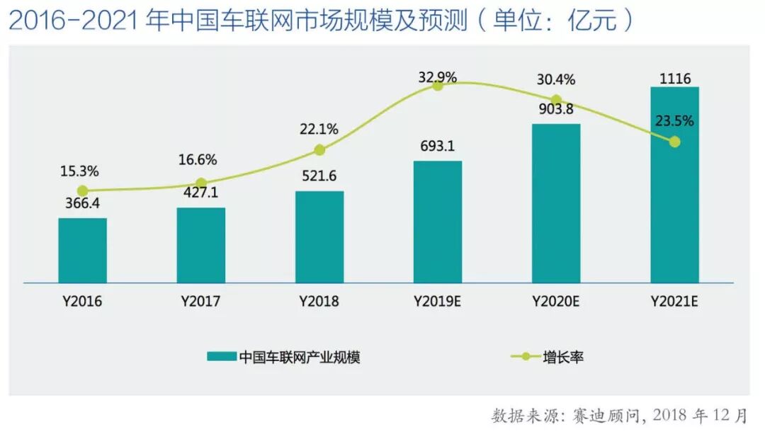 中国车联网产业在宏观政策、潜在市场、技术创新、基础设施建设等有利因素影响下,将保持快速增长。中国汽车市场巨大、保有量不断提升,新车搭载智能网联终端的比例将不断提升,预计2025年联网汽车渗透率将达到95%。而随着技术和服务的不断发展,用户对车联网功能的付费意愿也将提高。短期车联网市场增长主要依靠车载信息服务领域的新增硬件和用户增值消费,2019年将接近700亿元,2021年将达到1100亿元。同时由于2020年5G技术的推广应用、V2X技术发展、用户增值付费提升等因素,智能网联汽车将为市场带来新一轮发展机遇。