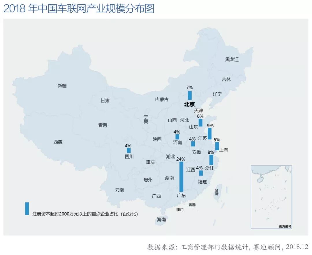 车联网企业主要集中在汽车电子、整车及互联网产业较为发达的东部沿海地区。对注册资本超过2000万元以上的车联网相关企业进行分析,广东企业数量达到24%,是全国最主要车联网产业基地。江苏、浙江、上海分布较为平均,凭借长三角地区雄厚的汽车产业链基础合计份额超过23%。同时北京凭借互联网产业基础和高新技术企业基础,占比为7%,结合产业资源分布,可以看出北京的企业数量虽少,但是规模较大。