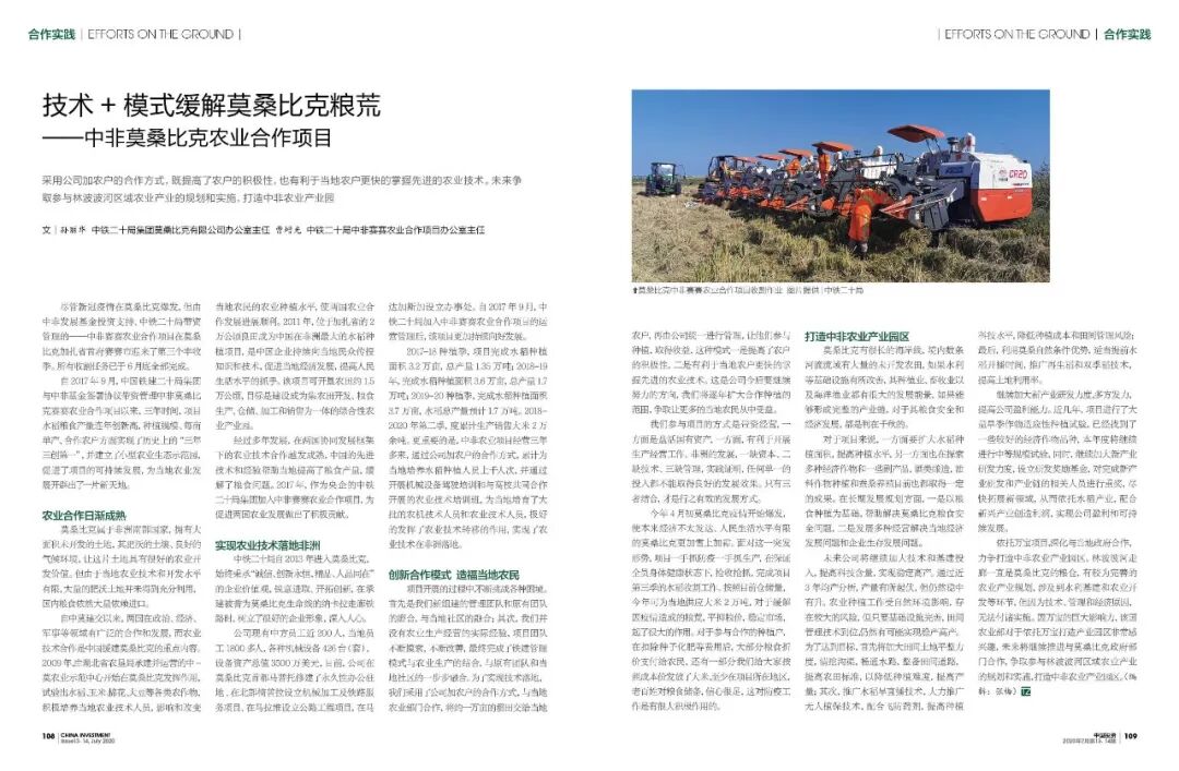 经过多年发展,在两国协同发展框架下的农业技术合作越发成熟,中国的先进技术和经验帮助当地提高了粮食产量,缓解了粮食问题。2017年,作为央企的中铁二十局集团加入中非赛赛农业合作项目,为促进两国农业发展做出了积极贡献。