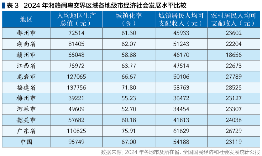 在湘赣闽粤交界区域内,各地市经济社会发展普遍滞后,经济发展水平、城镇化水平、城乡居民收入水平等指标不但普遍明显低于所在省平均水平,甚至低于全国平均水平(见表3)。