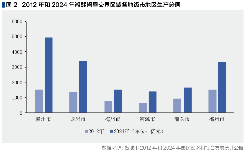 党的十八大以来,国家支持赣南等原中央苏区等革命老区加快发展的力度不断加大。2012年,为支持赣南等原中央苏区振兴发展,国务院印发《关于支持赣南等原中央苏区振兴发展的若干意见》。2013年8月,国务院办公厅印发《中央国家机关及有关单位对口支援赣南等原中央苏区实施方案》。2021年1月,国务院印发《国务院关于新时代支持革命老区振兴发展的意见》;2021年4月,国务院办公厅印发《新时代中央国家机关及有关单位对口支援赣南等原中央苏区工作方案》;2021年10月,国家发展改革委印发《湘赣边区域合作示范区建设总体方案》。2022年3月,国务院批复同意建设赣州、闽西革命老区高质量发展示范区。在国家政策措施的大力扶持下,湘赣闽粤交界区域经济实力明显增强,经济发展水平明显提高。2012年~2024年,湘赣闽粤交界区域地区生产总值由6649.03亿元增加到16250.40亿元,年均名义增速7.7%;人均地区生产总值由25744元增加到63084元,按名义价格计算增长了1.45倍。其中,赣州市的经济增长最快。2024年,赣州市地区生产总值4940.47亿元,是2012年的3.28倍,年均名义增速高达10.4%(见图2);人均地区生产总值分别为55048元,是2012年的3.08倍。赣州市的经济体量在湘赣闽粤交界区域的排名由次于郴州市的第2位跃升至第1位。