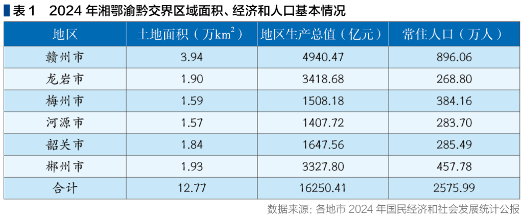 湘赣闽粤交界区域范围涉及湘东南、赣南、闽西和粤东、粤北地区,包括湖南省的郴州市,江西省的赣州市,福建省的龙岩市和广东省的梅州市、河源市和韶关市(见图1),土地面积合计12.74万平方公里,2024年常住人口2575.99万人、地区生产总值16250.41亿元(见表1)。湘赣闽粤交界区域多数地区属于赣南等原中央苏区的核心区域,是党中央、国务院实施赣南等原中央苏区振兴发展战略的重点区域。推动湘赣闽粤交界区域高质量合作发展,不仅是贯彻落实党的二十大精神支持革命老区加快发展的内在要求,还是促进省际交界地区高质量协同发展的关键抓手。