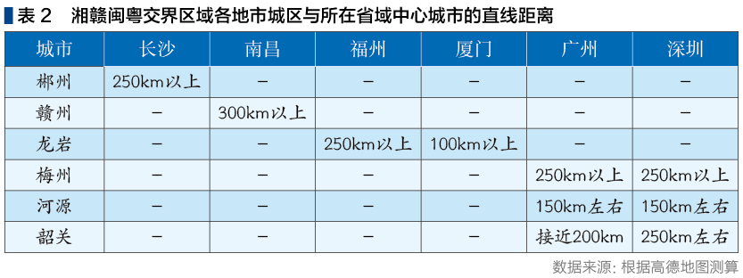 理论上讲,中心城市的人口规模越大,其经济辐射半径也越大,但现实中,中心城市的辐射半径存在极限。一般情况下,Ⅰ型大城市的辐射半径在100km左右,特大城市的辐射半径在150km左右,超大城市的辐射半径在200km左右。湘赣粤闽交界区域各地市普遍位于所在省域的地理边缘,与所在省域经济中心城市的距离普遍较远,很难通过接受中心城市的经济辐射加快经济社会发展(见表2)。此外,由于普遍位于所在省域的地理边缘,以山地丘陵为主的地形地貌导致投资回报率较低,湘赣粤闽交界区域各地市也往往不是所在省资金和资源投入的重点地区,不利于这些地区加快提升接受中心城市经济辐射的能力,使得这些地区经济社会发展水平普遍较为滞后。