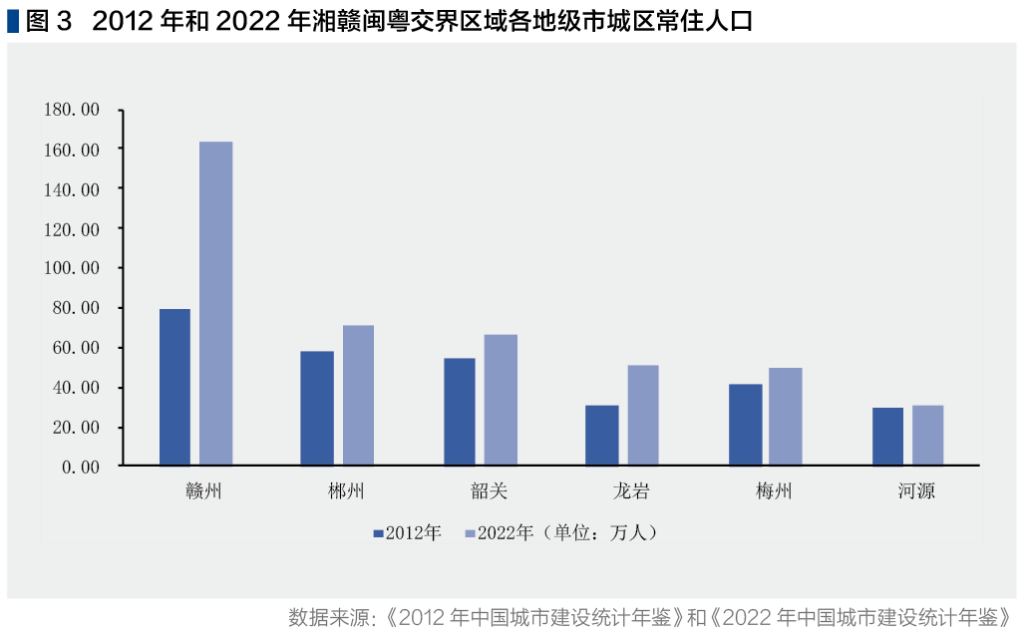 2012年~2024年,湘赣闽粤交界区域城镇化率由44.4%提高到59.0%,提高了14.6个百分点。其中,赣州市、龙岩市和郴州市的城镇化进程明显较快。2024年,赣州市、龙岩市和郴州市的城镇化率分别达到58.9%、66.7%和61.3%,相比2012年的增幅均超过15个百分点。随着区域城镇化水平不断提高,各级城市和城镇的人口规模也在逐渐壮大,其中尤以赣州、龙岩最为明显。2012年~2022年,赣州城区常住人口由78.89万人增加到163.30万人,由中等城市迈入百万人口的大城市行列;龙岩城区常住人口由30.66万人增加到50.42万人,由小城市发展成为中等城市(见图3)。