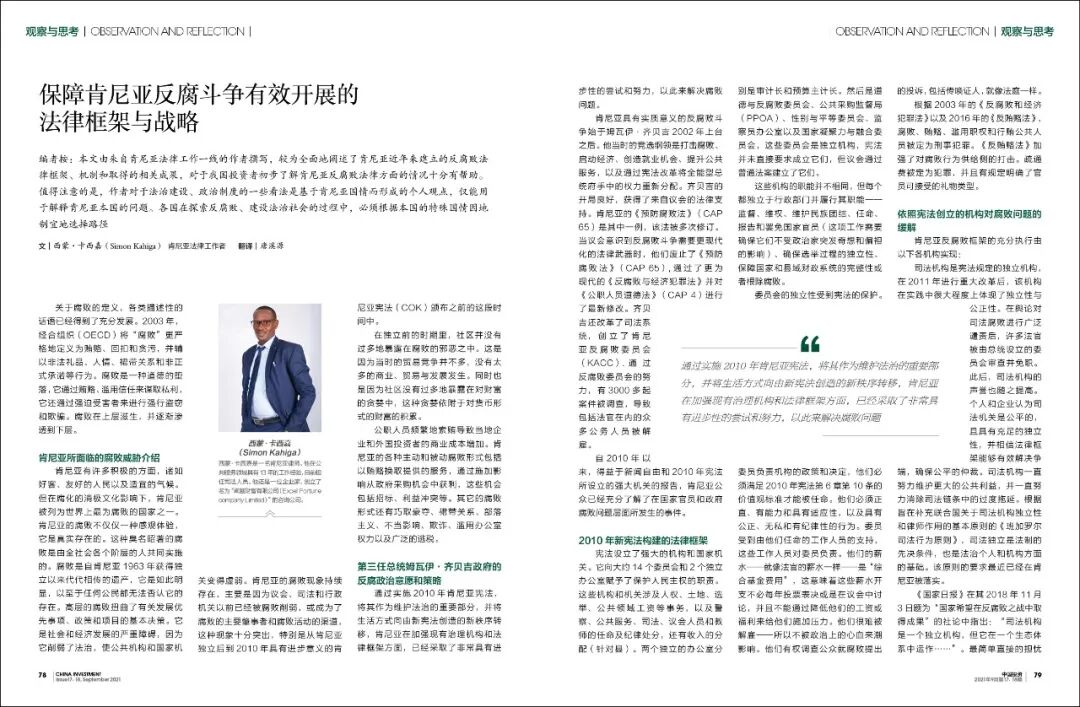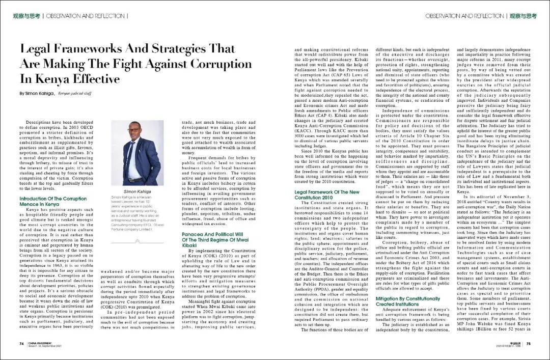 编者按:本文由来自肯尼亚法律工作一线的作者撰写,较为全面地阐述了肯尼亚近年来建立的反腐败法律框架、机制和取得的相关成果,对于我国投资者初步了解肯尼亚反腐败法律方面的情况十分有帮助。值得注意的是,作者对于法治建设、政治制度的一些看法是基于肯尼亚国情而形成的个人观点,仅能用于解释肯尼亚本国的问题。各国在探索反腐败、建设法治社会的过程中,必须根据本国的特殊国情因地制宜地选择路径